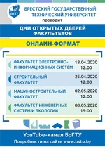 Брестский государственный технический университет информирует о проведении Дней открытых дверей факультетов в он-лайн формате на YouTube-канале университета. Подключиться к прямому эфиру можно по ссылке,расположенной на сайте www.bstu.by. Во время эфира можно задавать вопросы и получать ответы в режиме реального времени.